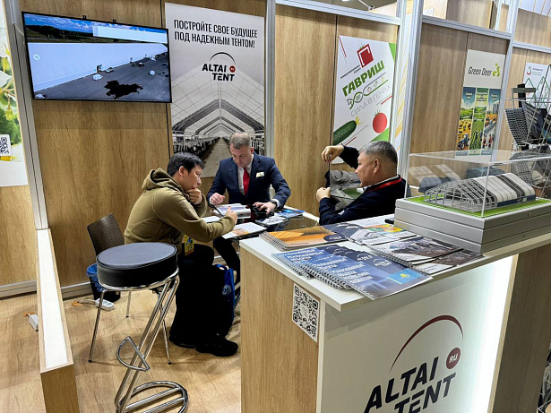 Сотрудники «Алтай-Тент» рассказали посетителям о многофункциональных ангарах для сельскохозяйственных нужд. Завод по производству стальных тентовых конструкций находится в Барнауле Алтайского края — приграничного с Казахстаном региона РФ. Поэтому логистические затраты на доставку продукции компании в дружественную страну ниже, чем у конкурентов.